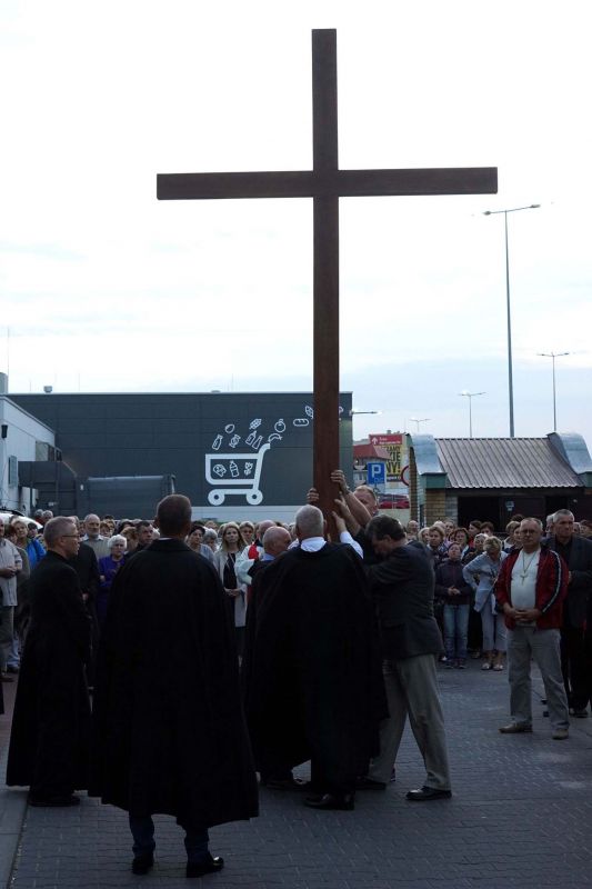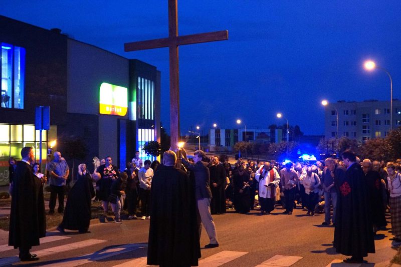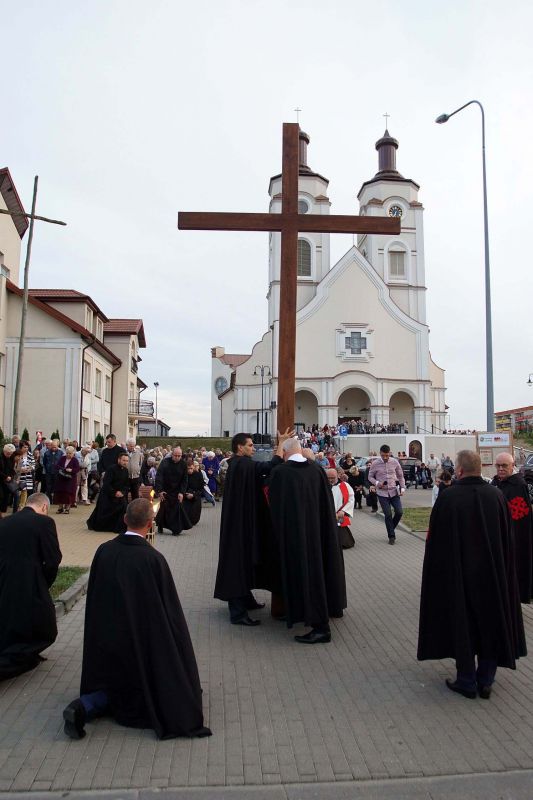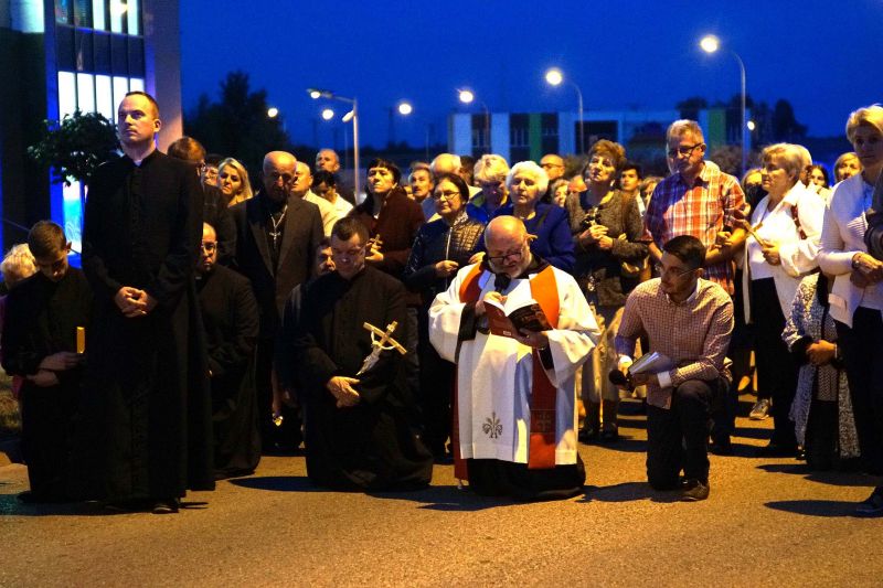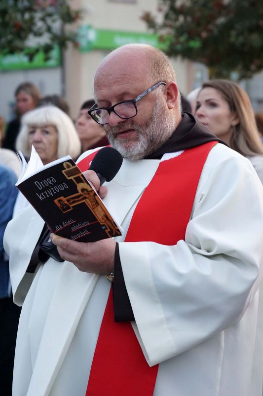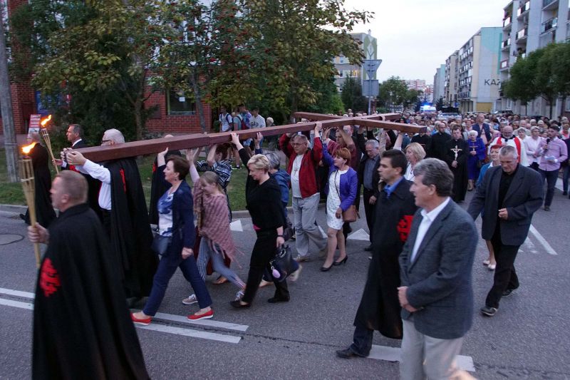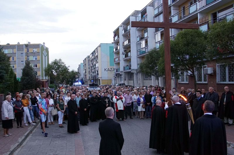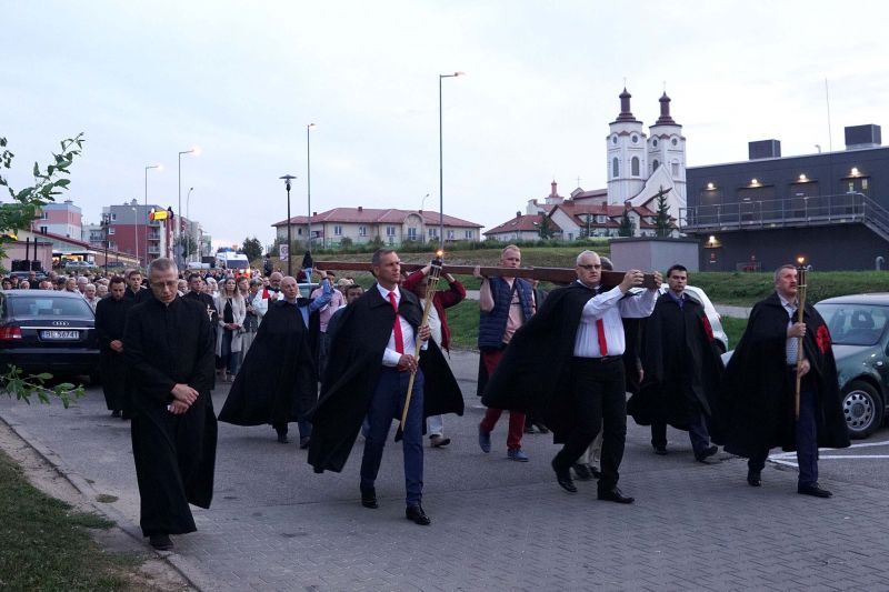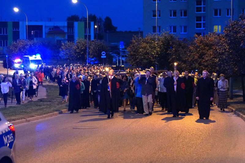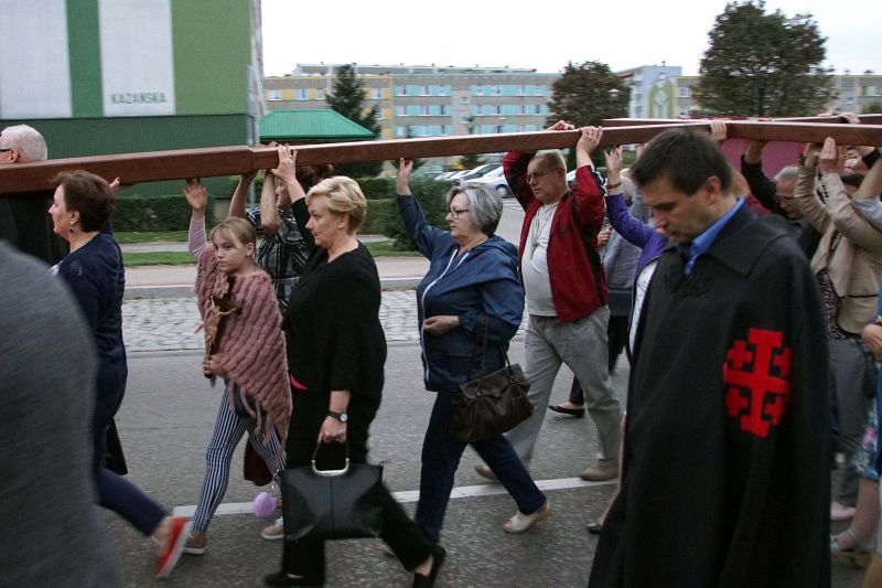 W czwartek, 13 września po wieczornej Mszy św. wyruszyliśmy ulicami naszego osiedla z nabożeństwem Drogi Krzyżowej, podczas których kilkuset parafian wysłuchało rozważań o. Waldemara przy każdej z XIV stacji. Także przy każdej ze stacji zmieniały się osoby niosące ogromny krzyż, który z kościoła jako pierwsi wynieśli członkowie Bractwa Krzyża – parafialni strażnicy relikwii Krzyża Świętego przechowywanych w naszej świątyni – niosąc go do stacji I.