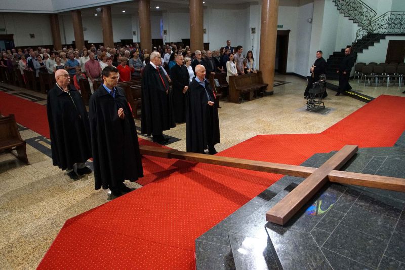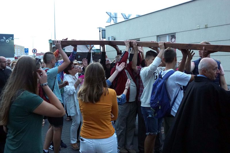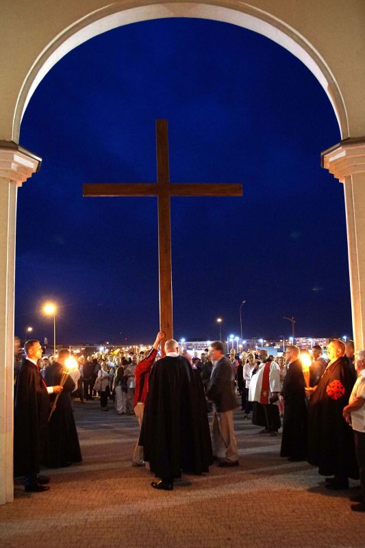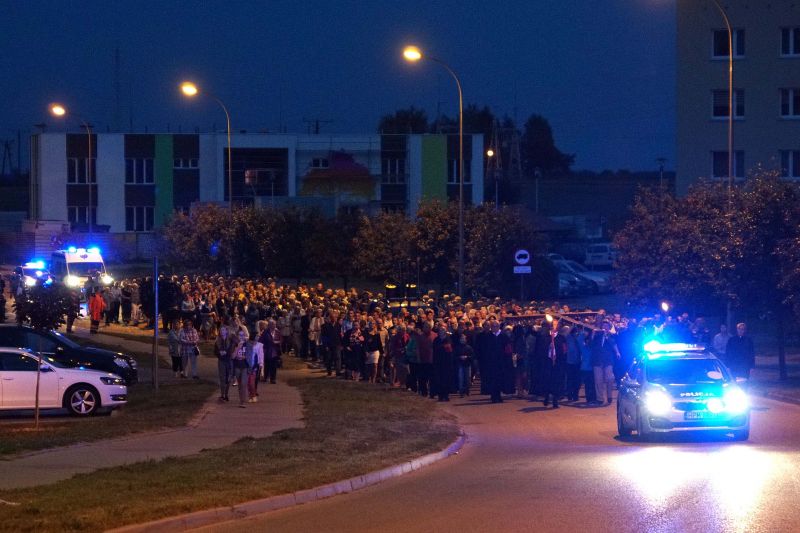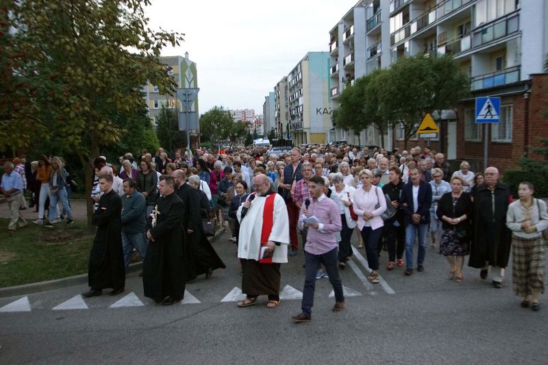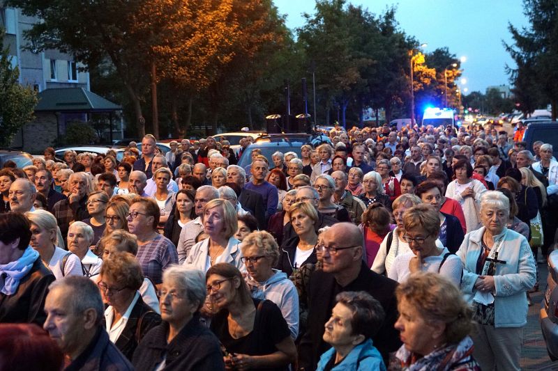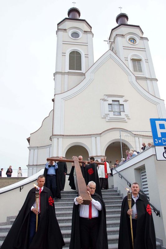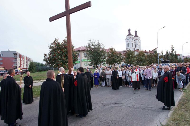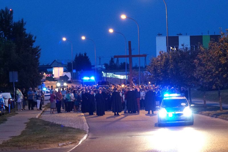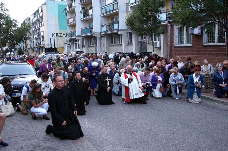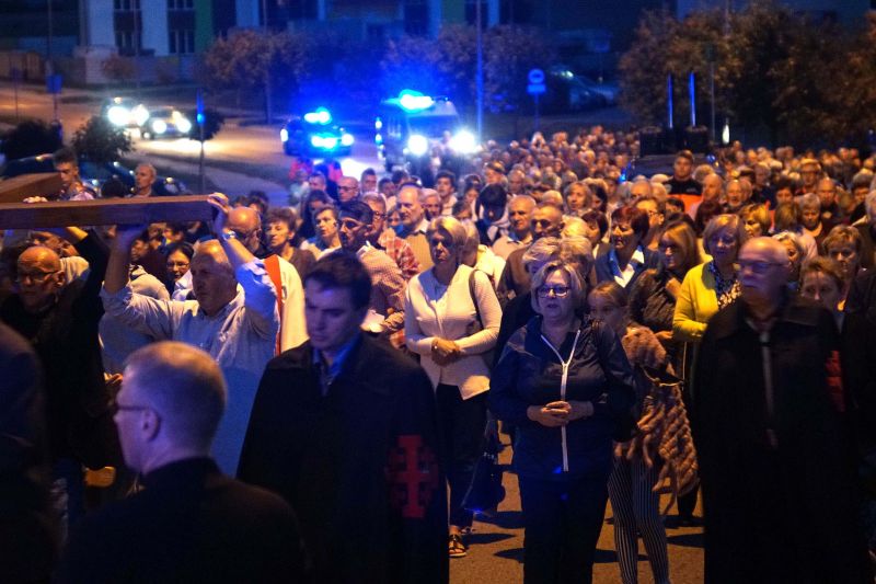 W czwartek, 13 września po wieczornej Mszy św. wyruszyliśmy ulicami naszego osiedla z nabożeństwem Drogi Krzyżowej, podczas których kilkuset parafian wysłuchało rozważań o. Waldemara przy każdej z XIV stacji. Także przy każdej ze stacji zmieniały się osoby niosące ogromny krzyż, który z kościoła jako pierwsi wynieśli członkowie Bractwa Krzyża – parafialni strażnicy relikwii Krzyża Świętego przechowywanych w naszej świątyni – niosąc go do stacji I.