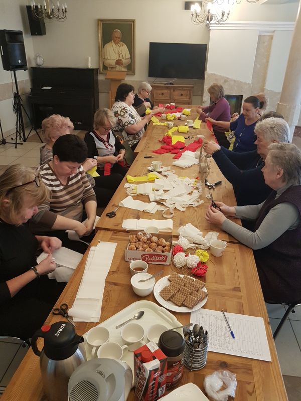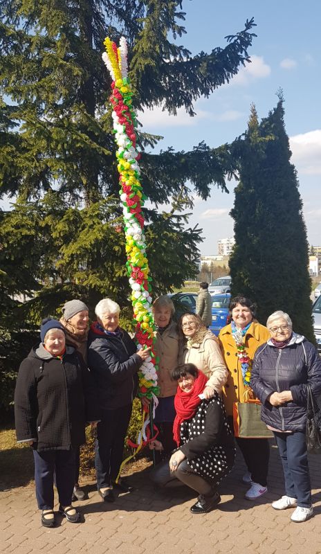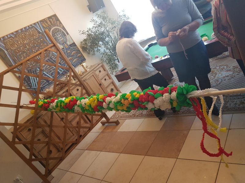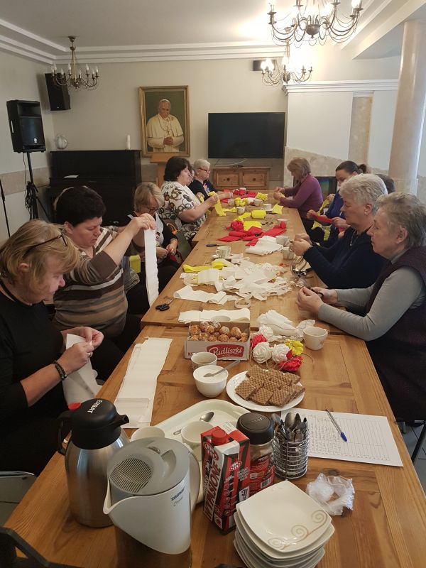 Po raz kolejny uczestniczki Akademii Aktywnego Seniora przy naszej parafii podjęły wyzwanie wykonania okazałej palmy na Niedzielę Palmową. Prace, pod kierunkiem Ewy Gąsiorowskiej, trwały przez kilka ostatnich tygodni i w Niedzielę Palmową, podczas Mszy św. o godz. 12.00 seniorki dumnie zaprezentowały swoje mierzące ponad 4 metry dzieło. Palma składa się z ponad 360 kwiatów wykonanych w trzech kolorach:białych, żółtych i czerwonych. Znajdujące się pomiędzy nimi zielone listki przypominają o budzeniu się przyrody do życia.