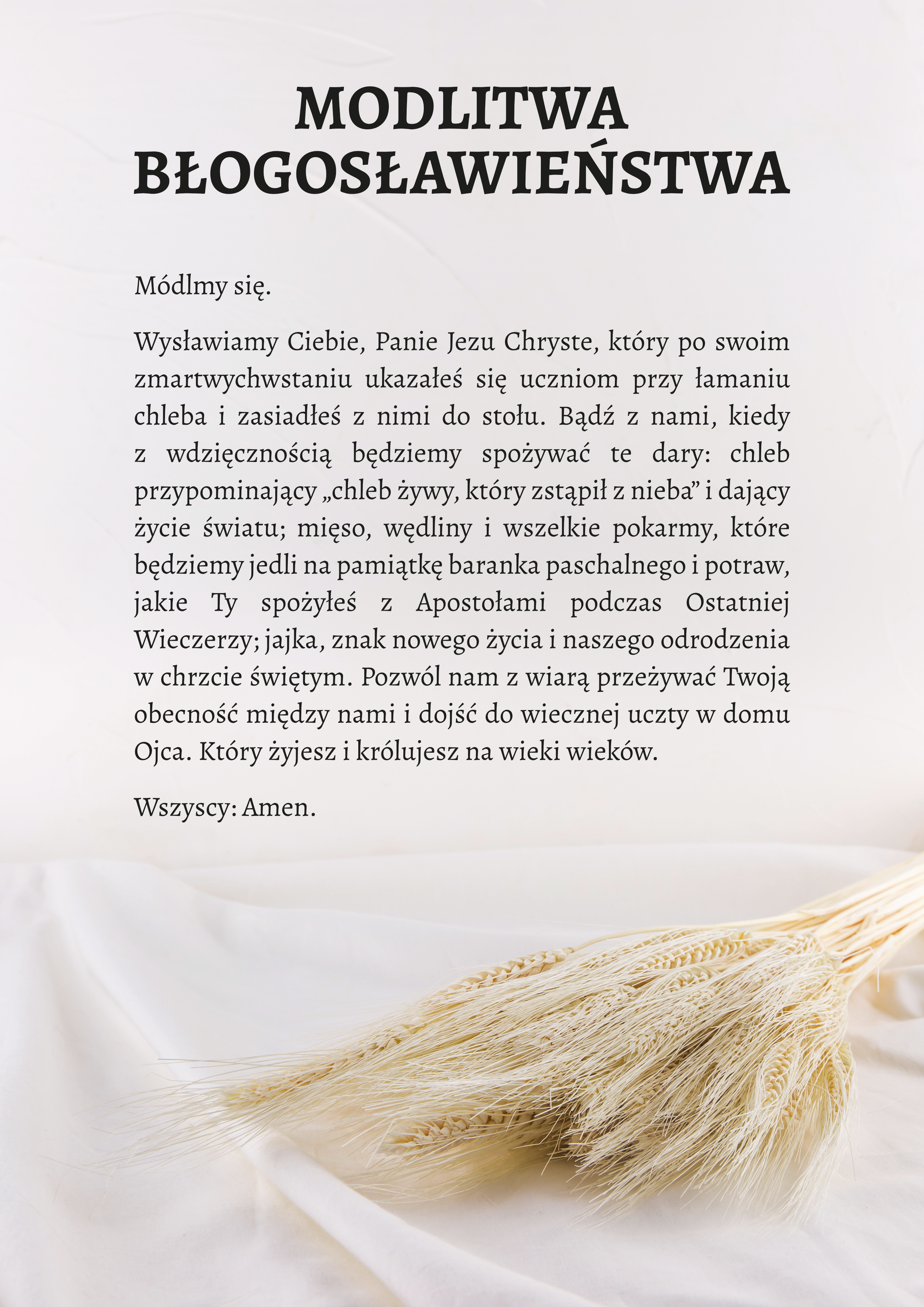 Wysławiamy Ciebie, Panie Jezu Chryste, który po swoim zmartwychwstaniu ukazałeś się uczniom przy łamaniu chleba i zasiadłeś z nimi do stołu. Bądź z nami, kiedy z wdzięcznością będziemy spożywać te dary: chleb przypominający „chleb żywy, który zstąpił z nieba” i dający życie światu; mięso, wędliny i wszelkie pokarmy, które będziemy jedli na pamiątkę baranka paschalnego i potraw, jakie Ty spożyłeś z Apostołami podczas Ostatniej Wieczerzy; jajka, znak nowego życia i naszego odrodzenia w chrzcie świętym. Pozwól nam z wiarą przeżywać Twoją obecność między nami i dojść do wiecznej uczty w domu Ojca. Który żyjesz i królujesz na wieki wieków.