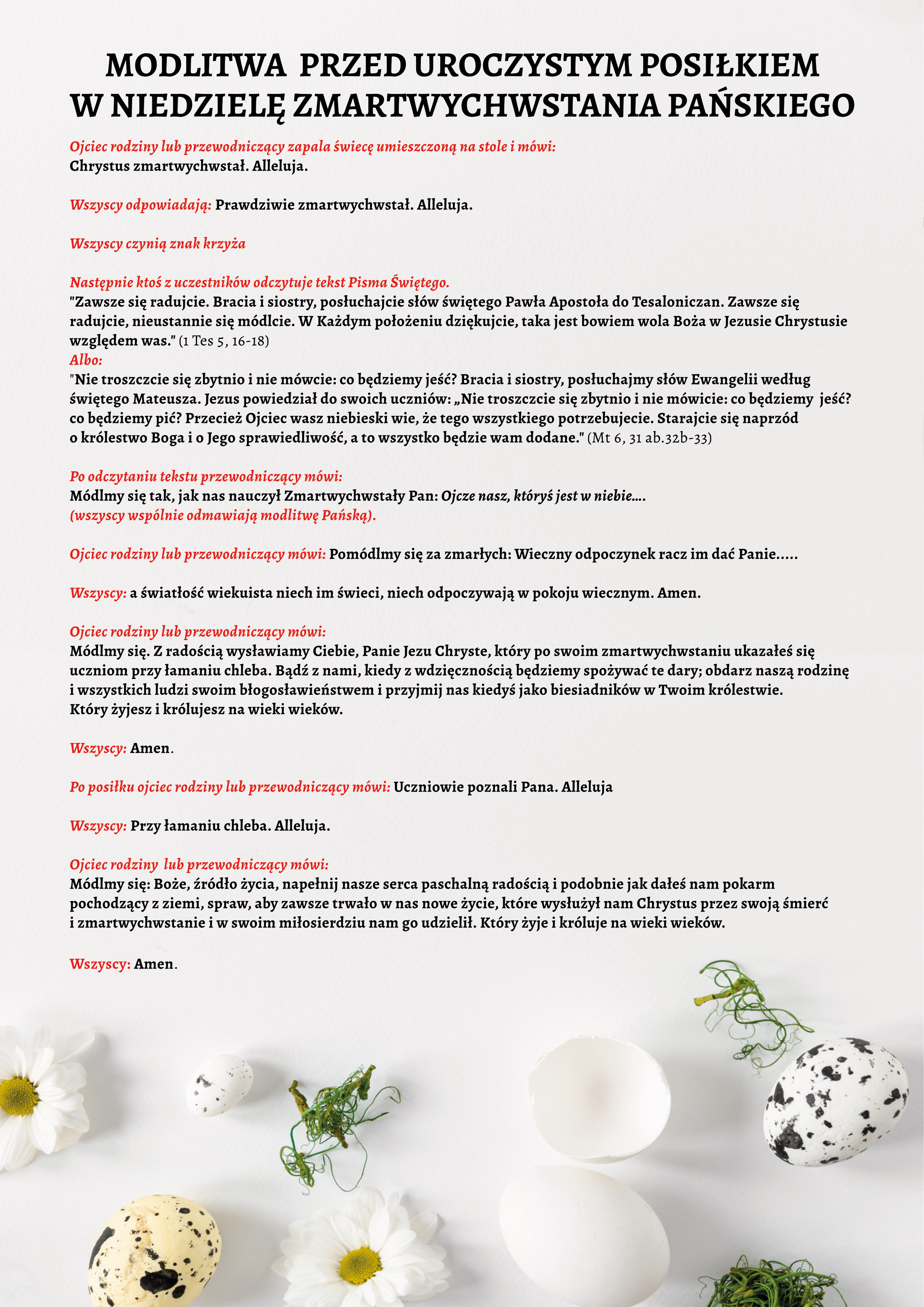 Módlmy się. Z radością wysławiamy Ciebie, Panie Jezu Chryste, który po swoim zmartwychwstaniu ukazałeś się uczniom przy łamaniu chleba. Bądź z nami, kiedy z wdzięcznością będziemy spożywać te dary; obdarz naszą rodzinę i wszystkich ludzi swoim błogosławieństwem i przyjmij nas kiedyś jako biesiadników w Twoim królestwie. Który żyjesz i królujesz na wieki wieków.