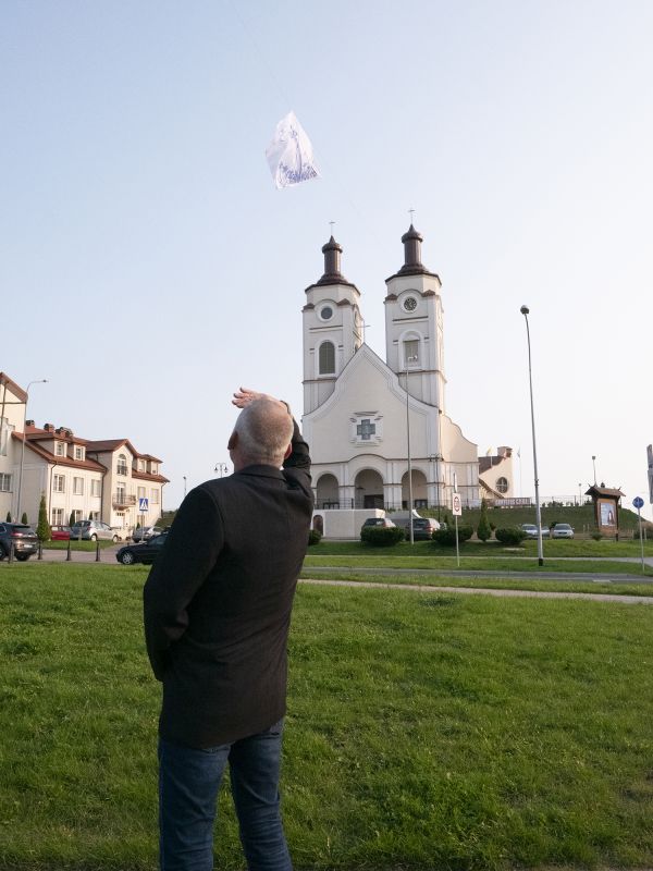 Przez całą drogę wiernym, biorącym udział w Drodze Krzyżowej, towarzyszyło ogromne logo naszej parafii wyniesione na ponad 100 metrów pod niebo przez Adama Babiela – członka Bractwa Krzyża i pasjonata lotów latawcami.