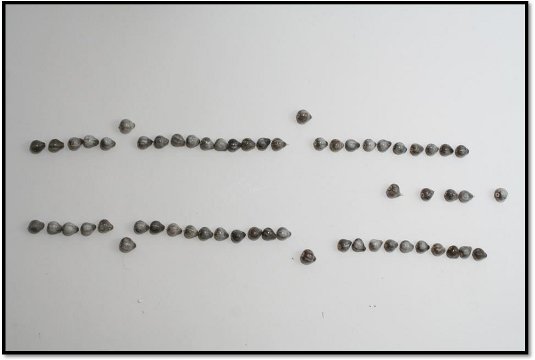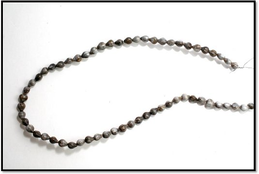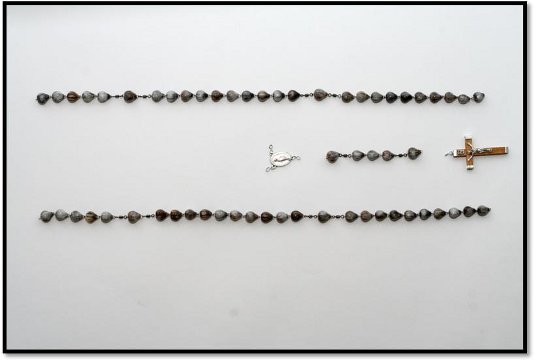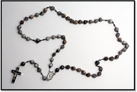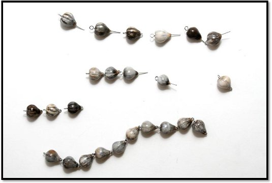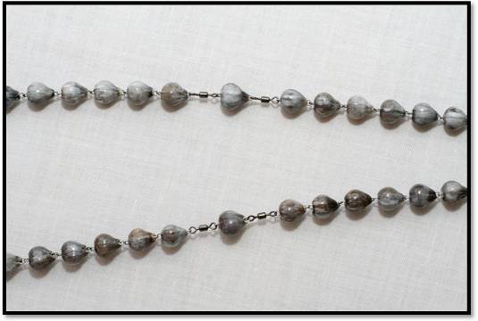Łezki Matki Bożej przygotowała nam sama natura. Nie trzeba wiercić w nich żadnych otworków. One już tam są. Wystarczy przeciągnąć drut przez środek. Paciorki są różnego kształtu, koloru i wielkości. Aby w różańcu prezentowały się pięknie należy je posegregować dobierając kształtem i wielkością. Można tez dobrać kolorem, chociaż różnobarwne także są ładne. Gdy już wybierzemy 59 paciorków układamy je luzem na stole tak jak w różańcu, zachowując odstępy między dziesiątkami. Paciorek łączący kolejne dziesiątki powinien być troszkę większy od pozostałych. Ułatwi to odmawianie Różańca szczególnie osobom starszym. Tak samo za krzyżykiem, pierwszy i piąty paciorek powinien być większy. Układamy paciorki zaczynając w połowie piątego dziesiątka. Tworzymy jakby dwie równoległe połowy różańca, lewą i prawą. W tym miejscu umownego, technicznego podziału, paciorki odwrócone są do siebie tyłem. Patrzą „noskami” w odwrotnym kierunku. Schodzą z dwóch stron równolegle w dół do łącznika trójramiennego i dalej noskiem w dół aż do krzyżyka.
