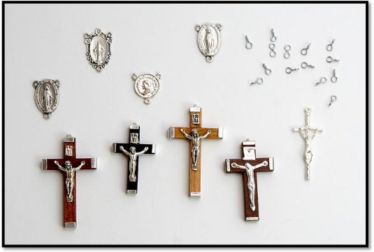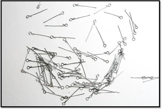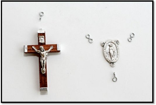 Można stosować każdy rodzaj drutu. Różaniec powinien być jednak mocny i wytrzymały. Najlepszy i najbardziej trwały jest drut półstalowy (z linki). Po rozplataniu pojedynczy drut przycinamy szczypcami na krótsze odcinki (łatwiej trzymać je w ręce). Łapiemy drut szczypcami ok. 2mm od końca i odginamy go lekko do tyłu. Następnie przekładamy szczypce chwytając drut w miejscu zgięcia i ruchem obrotowym do przodu zawijamy go robiąc oczko z dwiema końcówkami - jedną króciutką, drugą po całości drutu. Lekko jeszcze poprawiamy by oczko właściwie uformować, po czym przycinamy drut w części całościowej na długość ok. 2cm (liczoną razem z oczkiem). Tak przygotowanych drucików potrzeba nam 59 sztuk. Lepiej zrobić więcej, ponieważ w trakcie dokonujemy pewnych poprawek i musimy zmieniać druciki.
