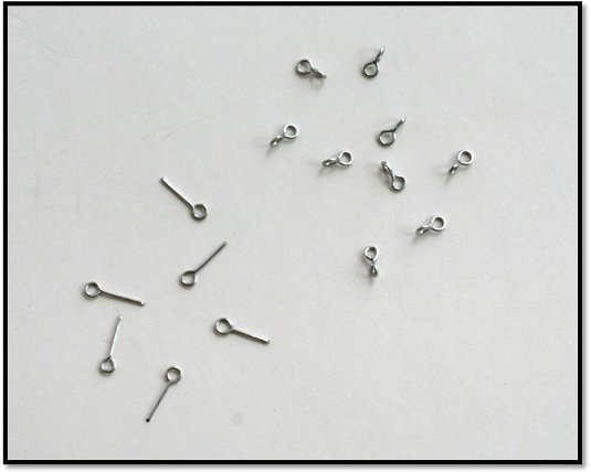 Z drutu półstalowego, którego wcześniej używaliśmy tniemy odcinek ok. 20cm. Chwytamy szczypcami z jednej strony końcówkę drutu i ruchem obrotowym do przodu zawijamy go robiąc oczko z jedną końcówką długą, tą którą trzymamy w ręku. Na wysokości styku oczka chwytamy szczypcami drut całościowy i odginamy go lekko do tyłu formując właściwie oczko. Następnie przycinamy drut z oczkiem, tak by długość końcówki wynosiła ok. 1cm. Chwytamy palcami lewej ręki oczko, a szczypcami trzymanymi w prawym ręku chwytamy końcówkę drutu i ruchem obrotowym do przodu zawijamy go robiąc drugie oczko (w identyczny sposób jak pierwsze). Oczka względem siebie uformowane są prostopadle i tak być powinno. Takich łączników potrzebujemy 14 sztuk na jeden różaniec. Starajmy się, aby długość tych łączników była jednakowa. Ważne jest to przy łączeniu dziesiątków. Będą one na jednej wysokości. Różaniec ładnie wtedy wygląda.